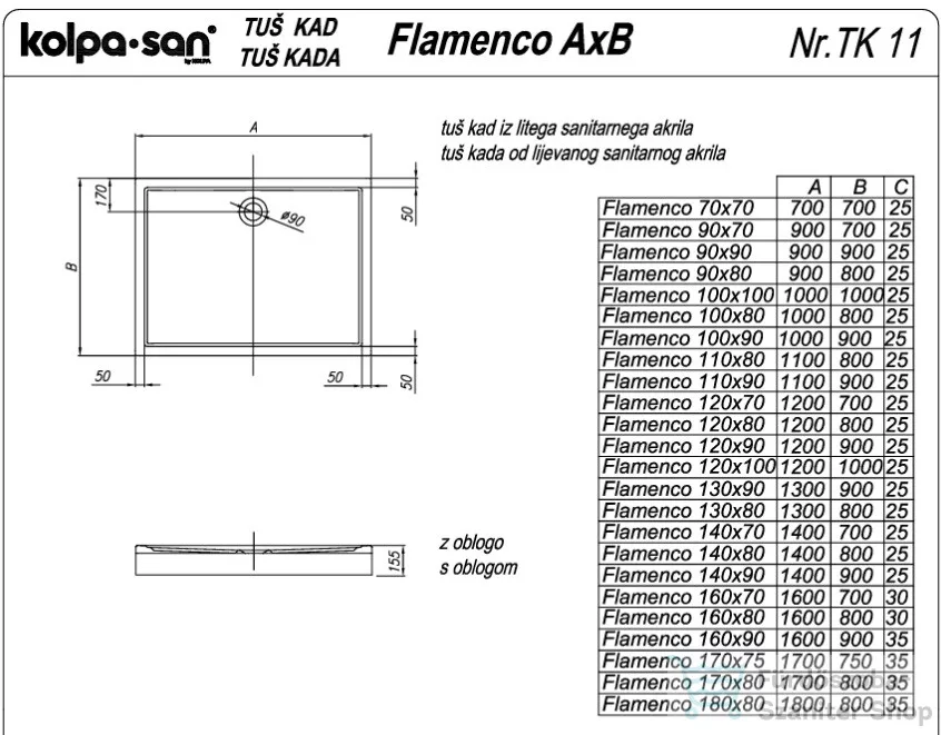 Kolpa San FLAMENCO 160x70 cm-es zuhanytálca előlappal, szifon nélkül, fehér 534580