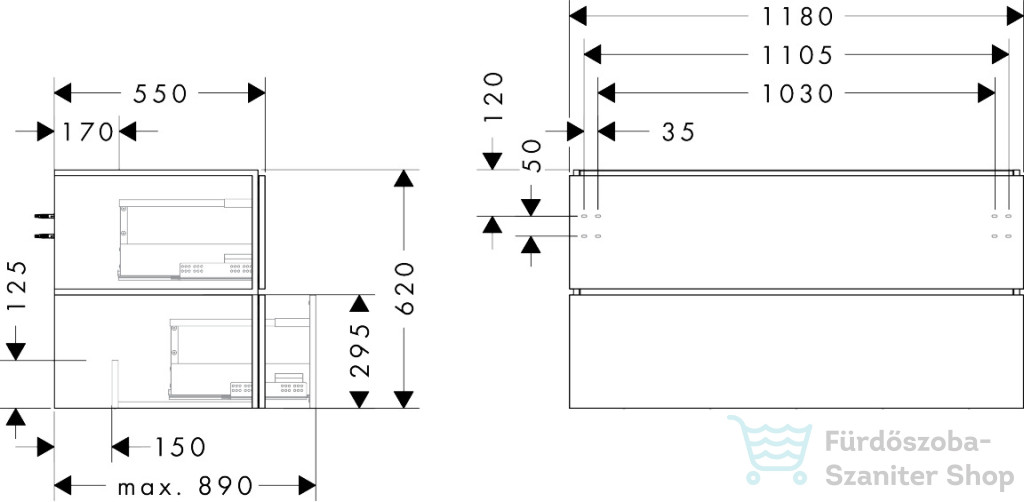 Hansgrohe XILESA E 118x55 cm-es, 2 fiókos, fali mosdótartó szekrény pulthoz, push open fiókokkal, kasmír tölgy 54304550